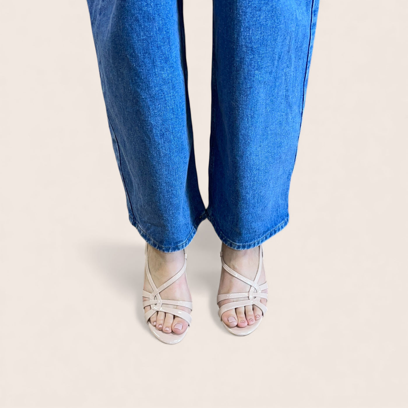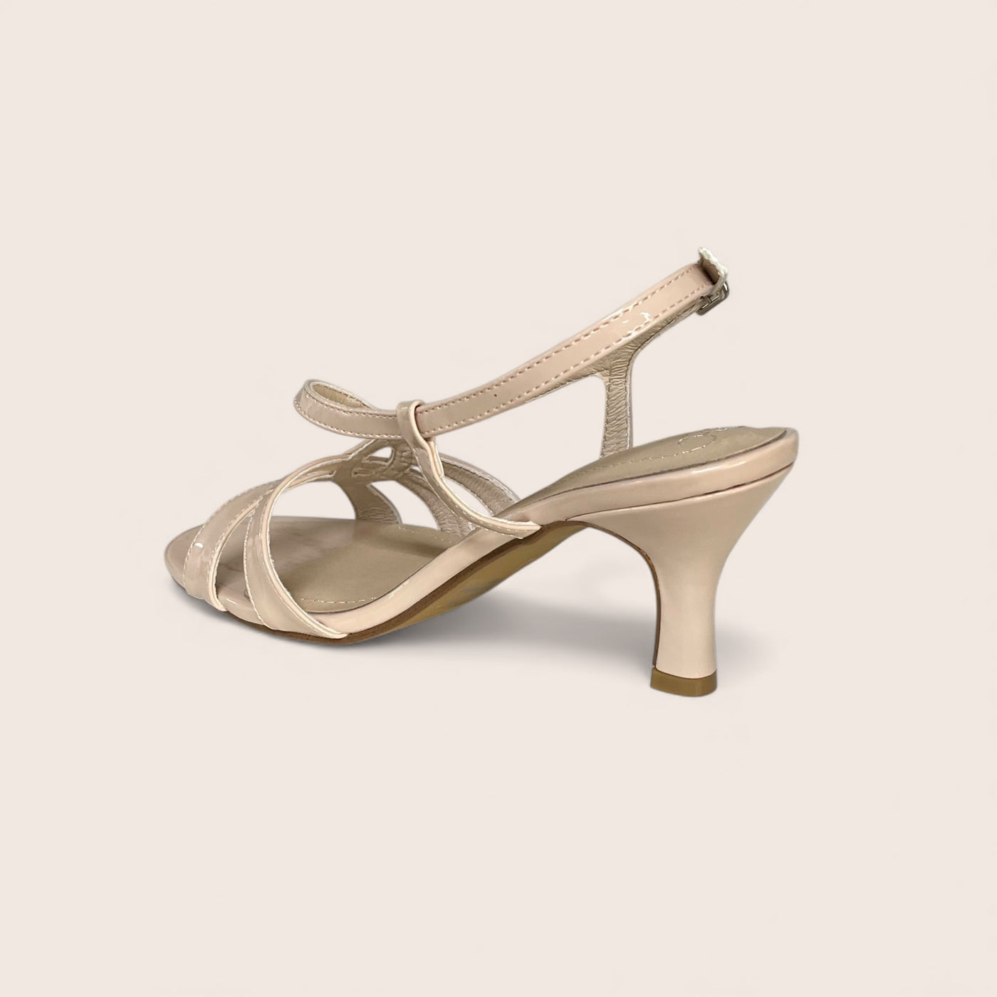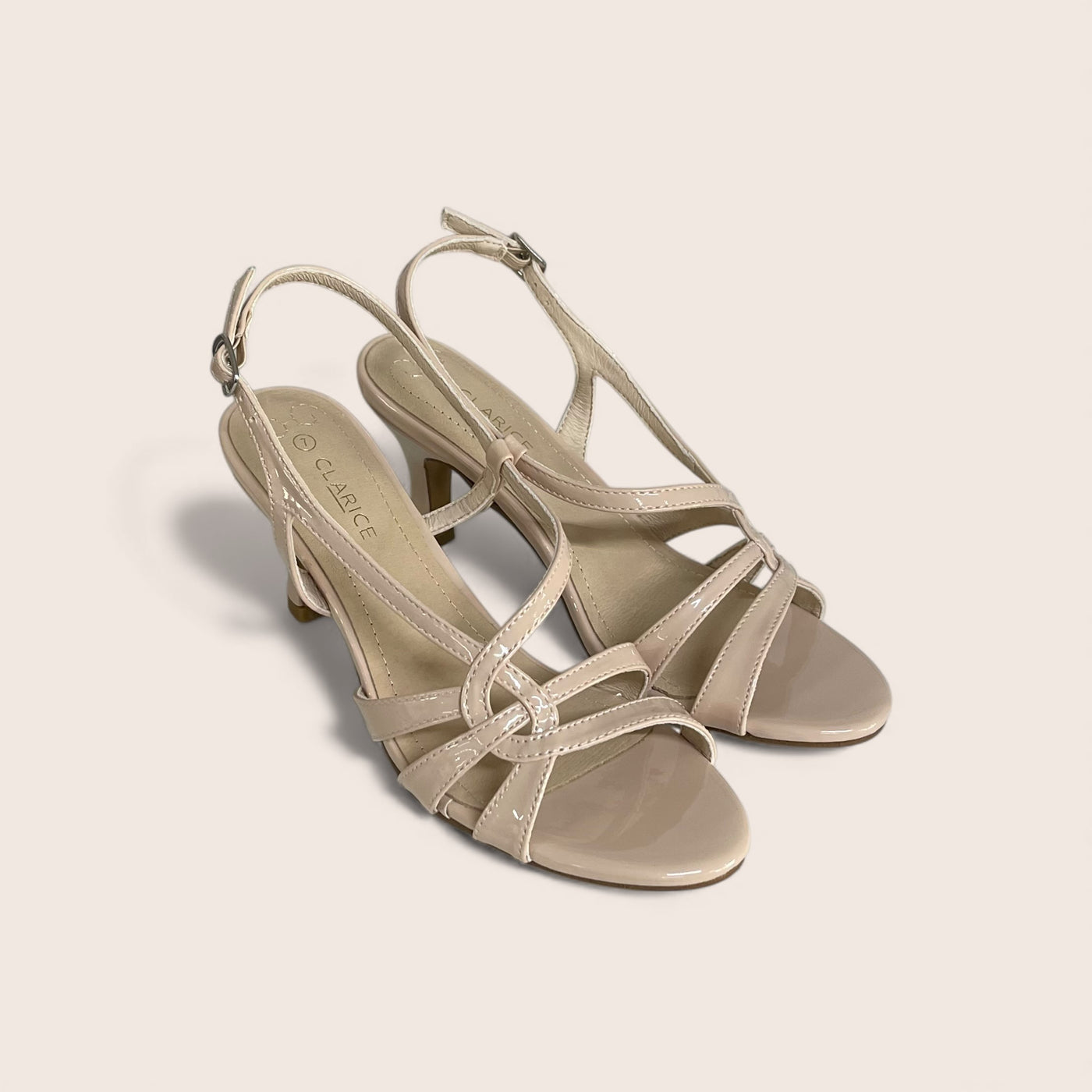 Bolty by Clarice is a sleek, statement heel made to turn heads. In glossy nude patent, delicate straps crisscross over the toes and wrap around the ankle with a refined buckle, while the finer heel elongates the leg for a sophisticated finish. With a soft leather sock and precise detailing, Bolty combines glamour and polish for effortless night-out style.