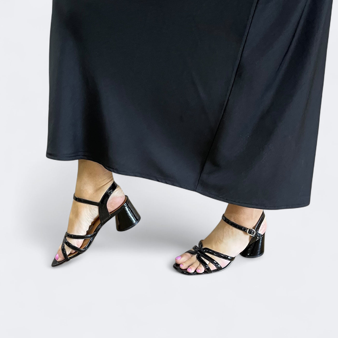 Petah by EOS is the ultimate modern heel for after-dark dressing. In glossy black crinkle patent, she’s all about refined detail — fine straps across the toes, a secure ankle strap with buckle, and that statement round heel stealing the spotlight. Luxe, architectural, and endlessly versatile, Petah is designed to turn heads with every step.
