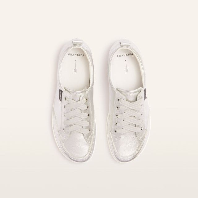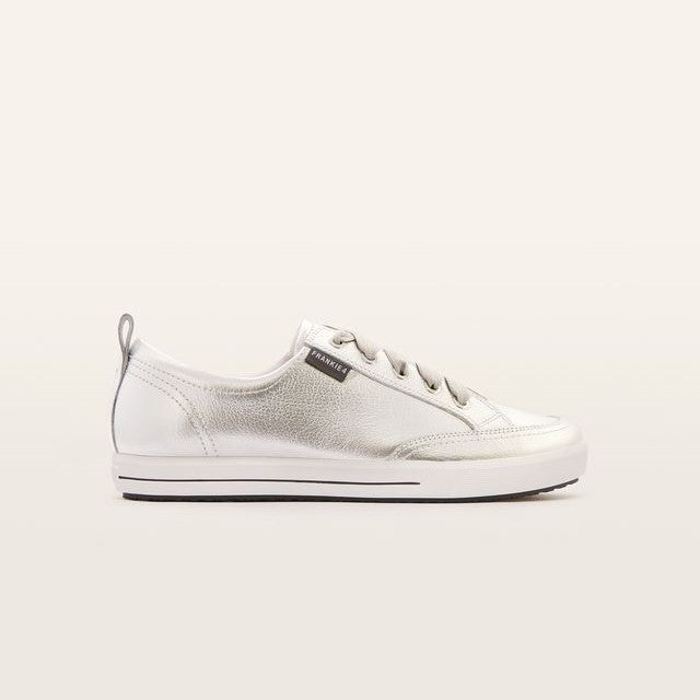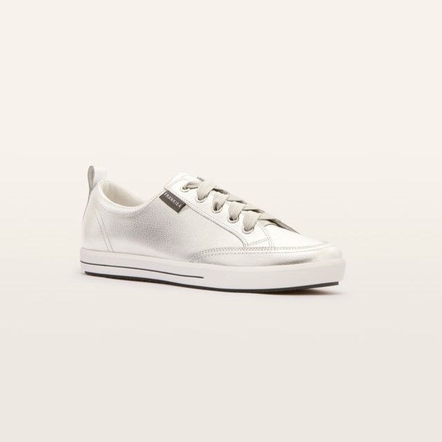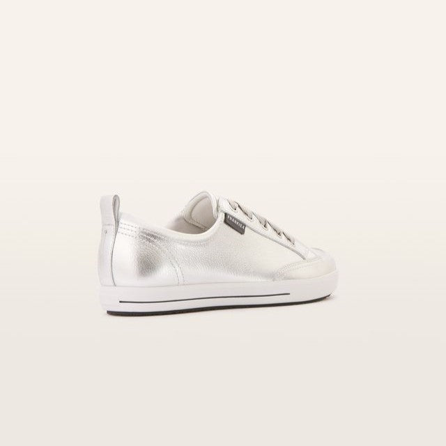 Enhance your daily wardrobe with Ellie in statement Silver Tumbled. This refreshed sneaker favourite maintains the same fit and feel you love but with a slightly softened toe for a contemporary touch. Featuring jacquard-weave ribbon laces and additional recycled cotton laces provided for versatile styling, Ellie is a mainstay with true versatility. With a triple-layer support and cushion system, custom fit options, and podiatrist-designed footbed technology, Ellie combines classic style with all-day comfort. Handcrafted leather and eye-catching sole details complete the look. A perfect designer sneaker with everyday comfort.