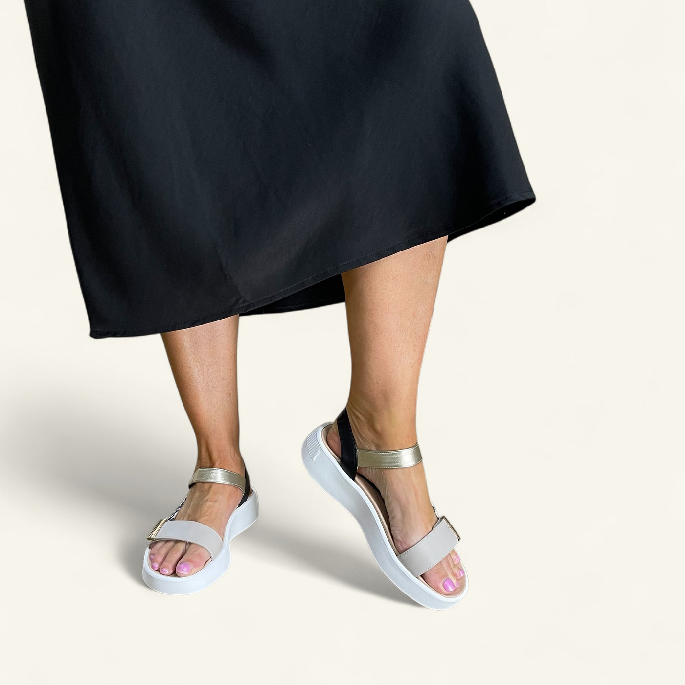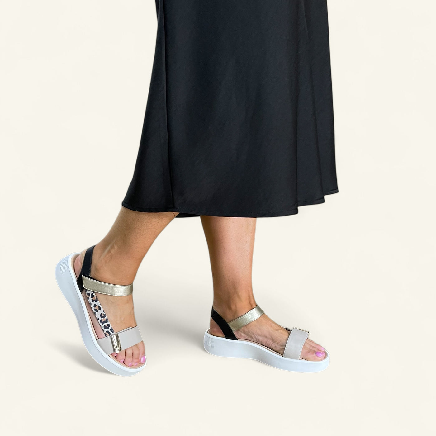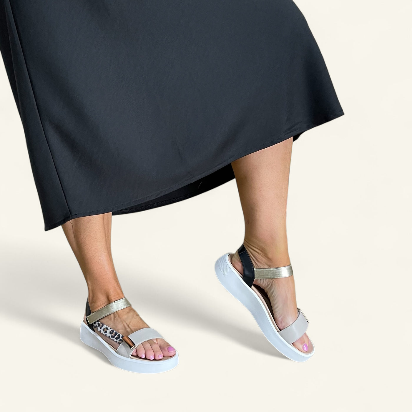 Step out in style and support with Ivory by Klouds, a fashionable travel sandal with a playful twist. Modelled on a popular sandal look, this extra-wide fitting style offers two points of hook-and-loop adjustment for a custom fit, built-in arch support for all-day comfort, and an off-white chunky sole that adds just the right amount of lift and trend appeal.