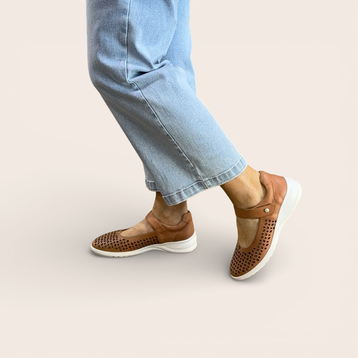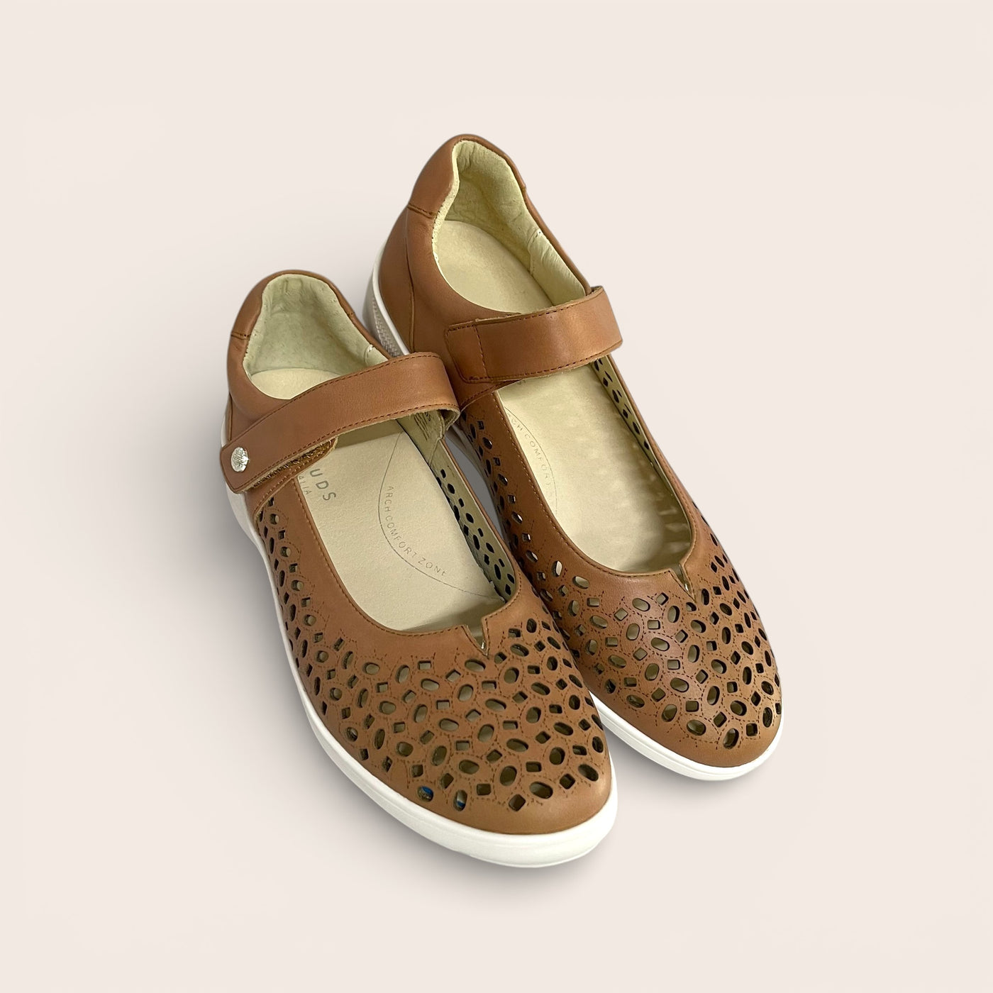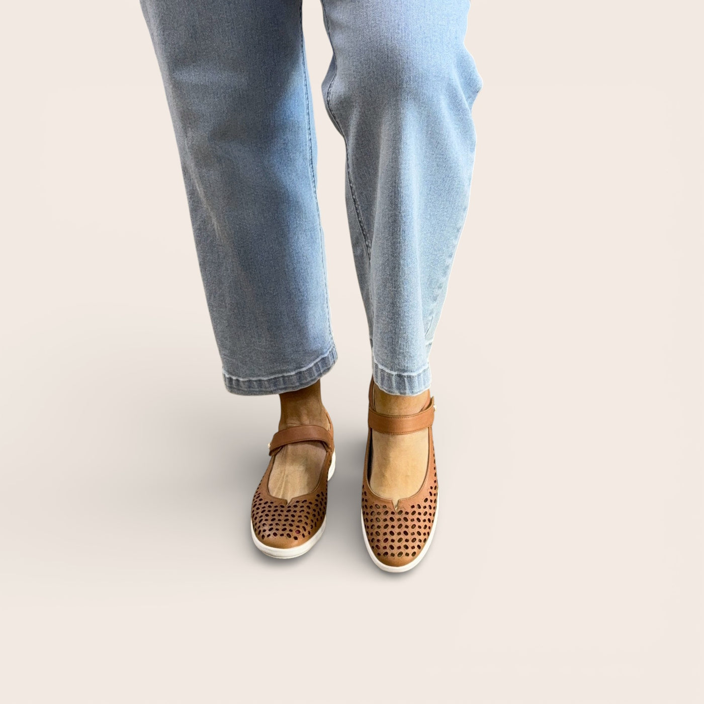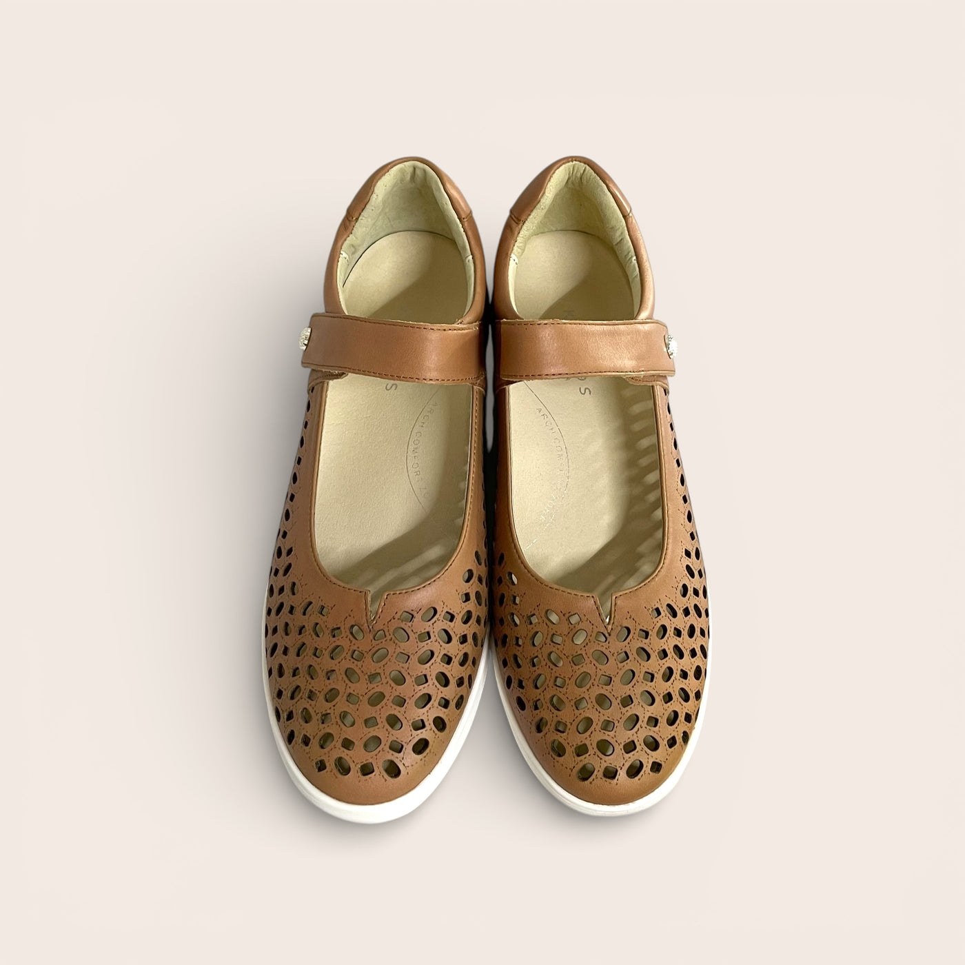 Blissed is the perfect blend of classic Mary Jane styling and signature Klouds comfort. Crafted in soft caramel leather, this lightweight design features delicate laser cut detailing for breathability and interest, while the metallic-accent strap adds a modern touch. Supportive, cushioned and beautifully wearable, Blissed is designed for all-day ease without sacrificing style.
