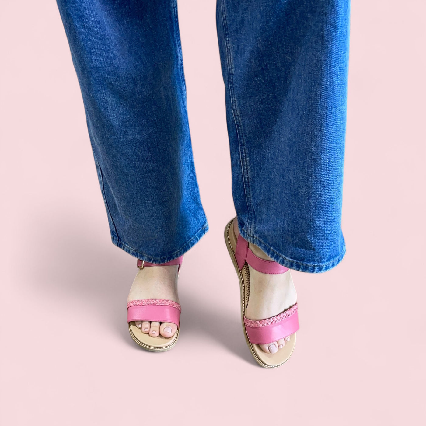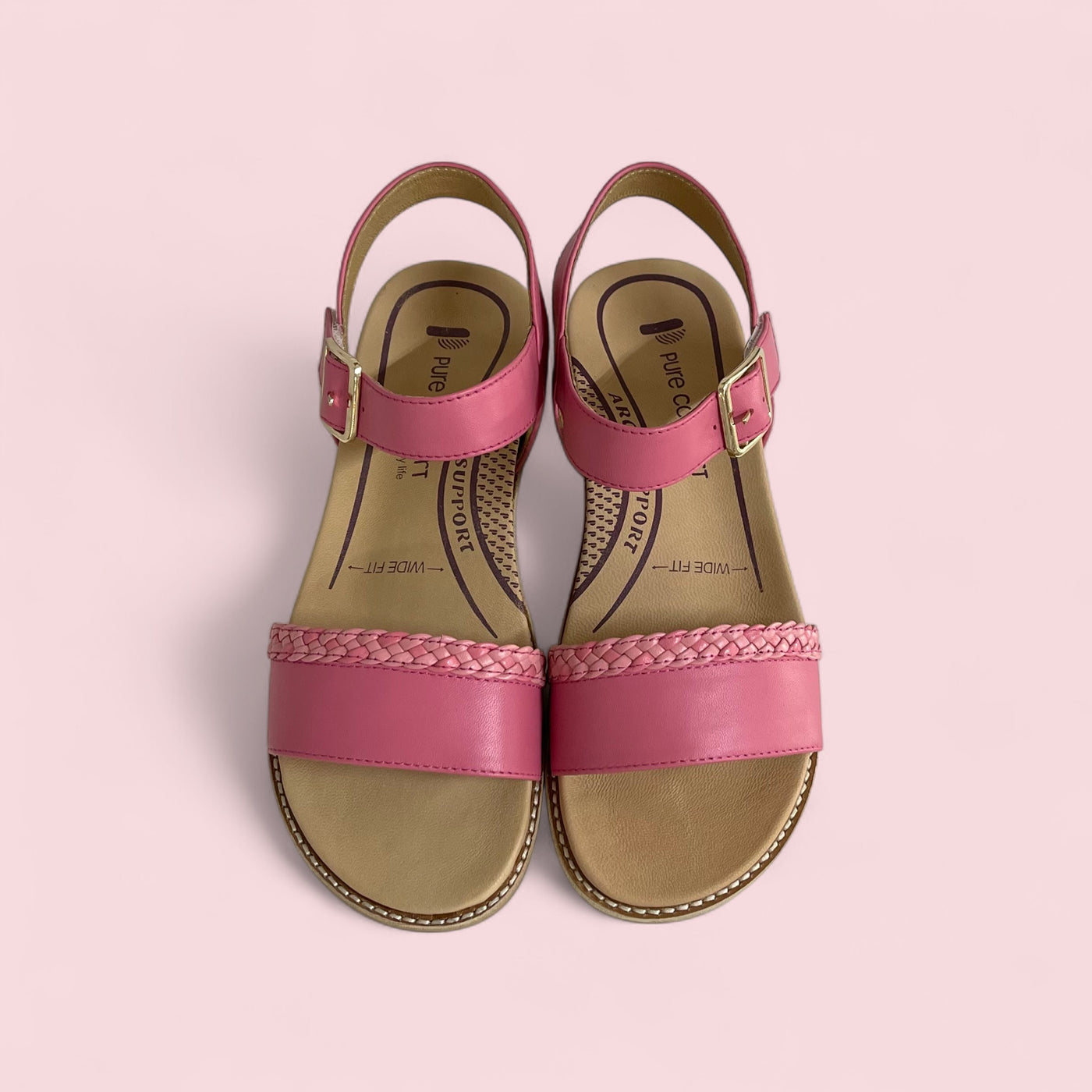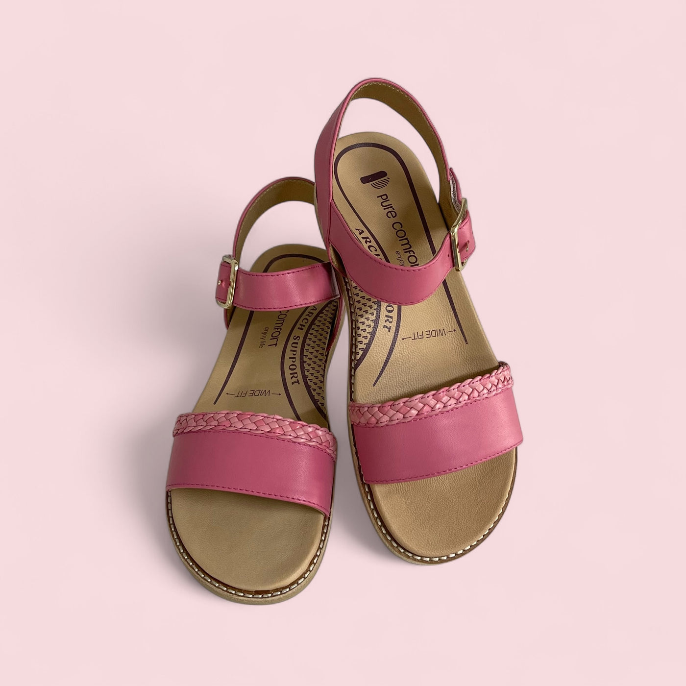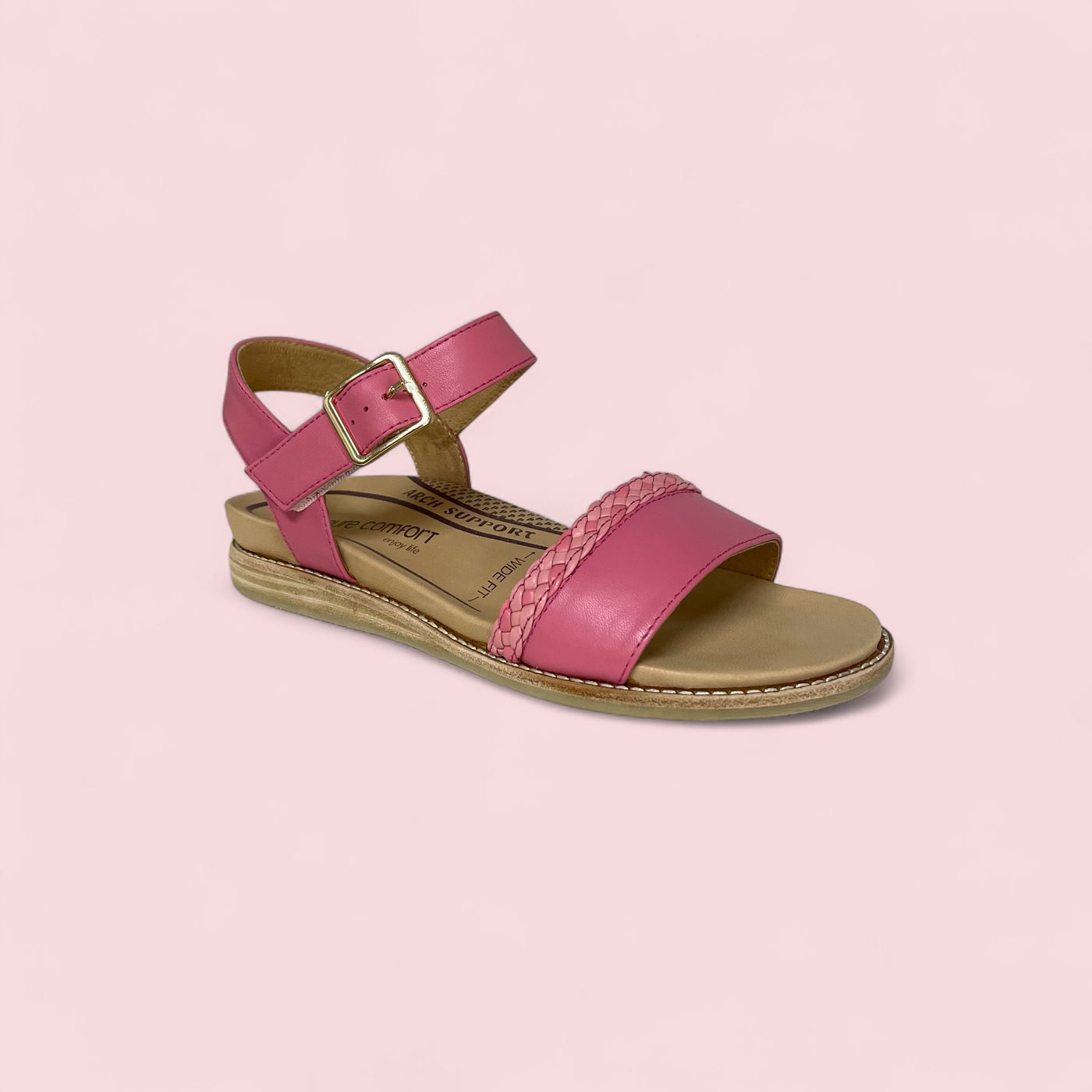 Hariet by Pure Comfort proves that comfort can be fun. In a soft pink leather with a wider fit and arch support, this sandal brings easy wear to every step. The front band features braided strap across the toes and adds a playful twist, while the small wedge and hook and loop adjustable ankle strap keep things stylish yet secure. A go-to when you want colour, comfort, and a little extra charm.