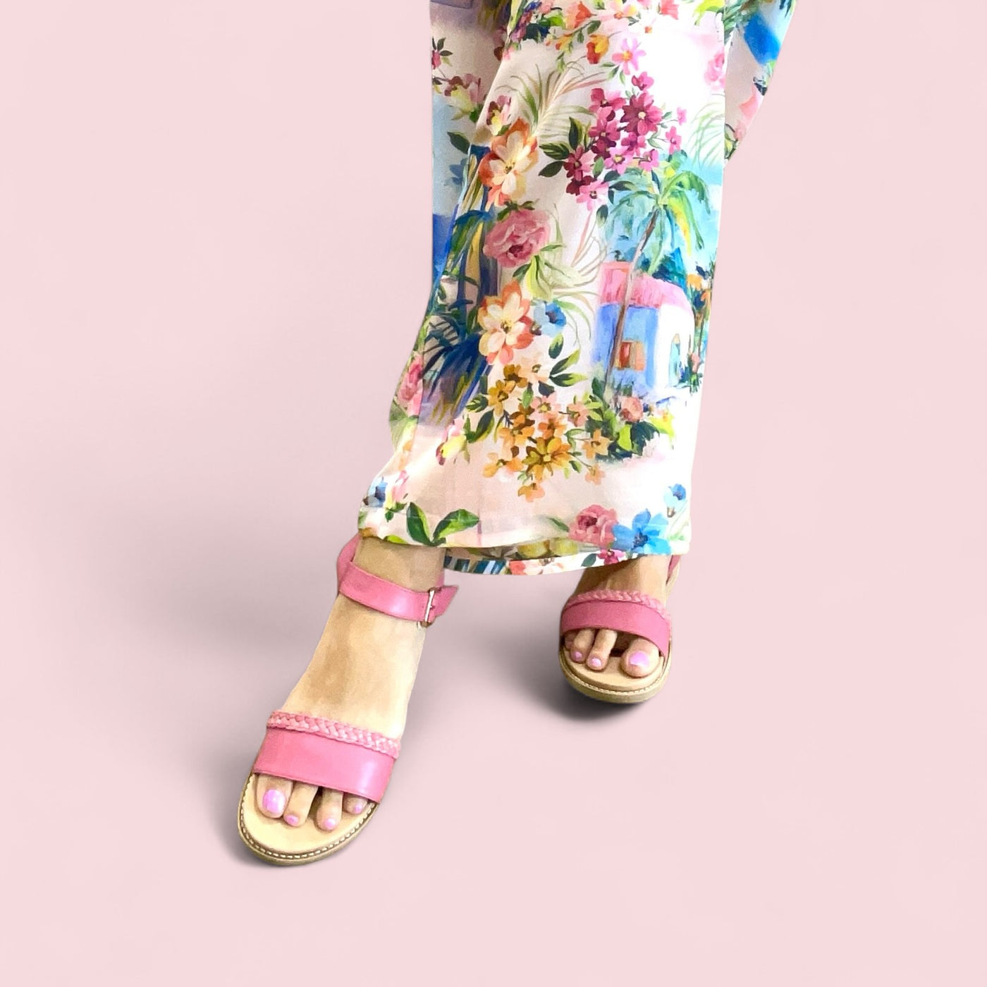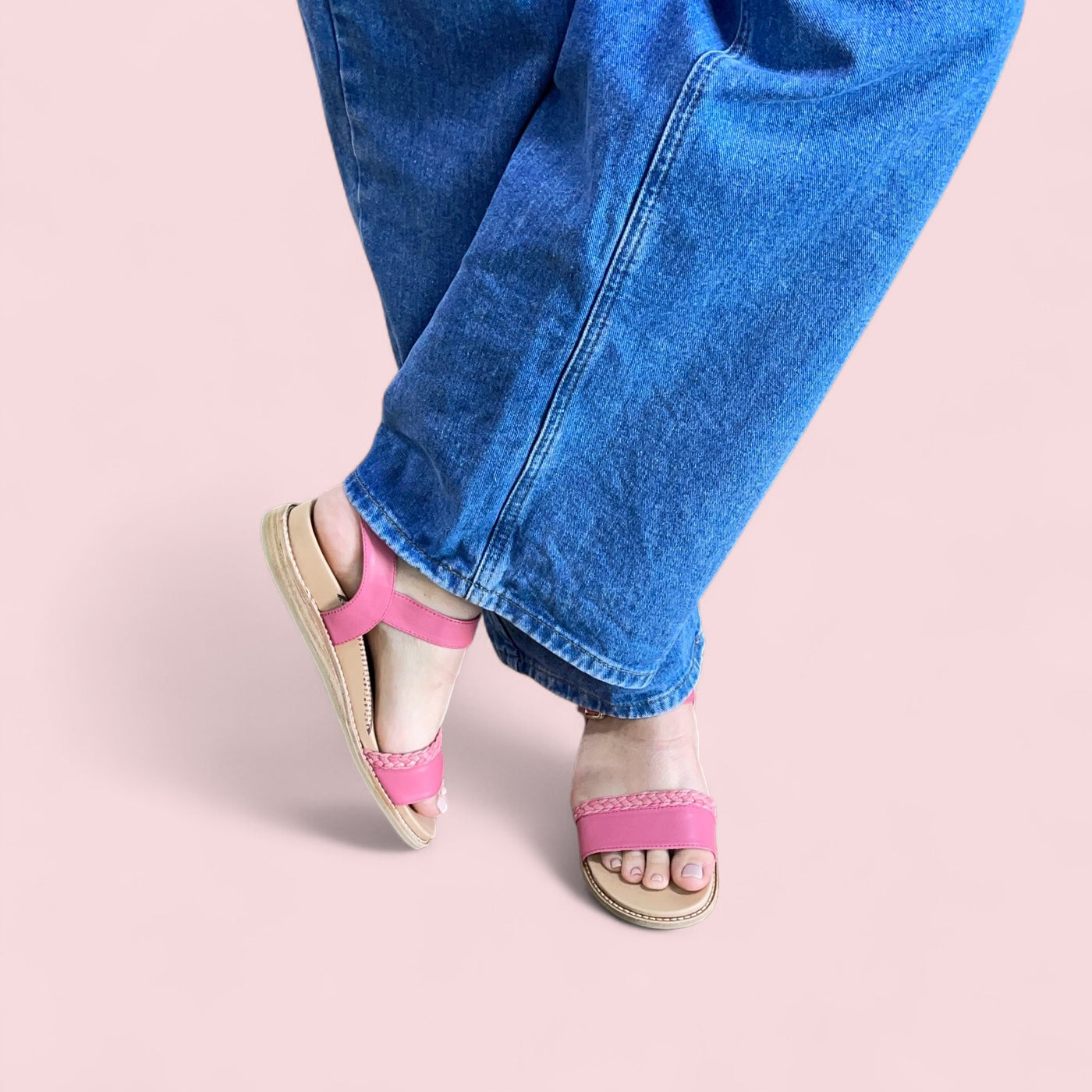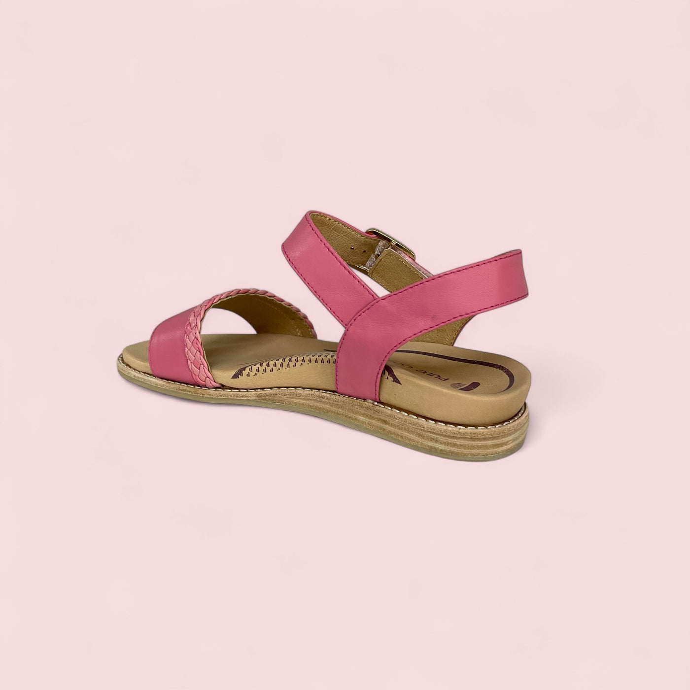 Hariet by Pure Comfort proves that comfort can be fun. In a soft pink leather with a wider fit and arch support, this sandal brings easy wear to every step. The front band features braided strap across the toes and adds a playful twist, while the small wedge and hook and loop adjustable ankle strap keep things stylish yet secure. A go-to when you want colour, comfort, and a little extra charm.
