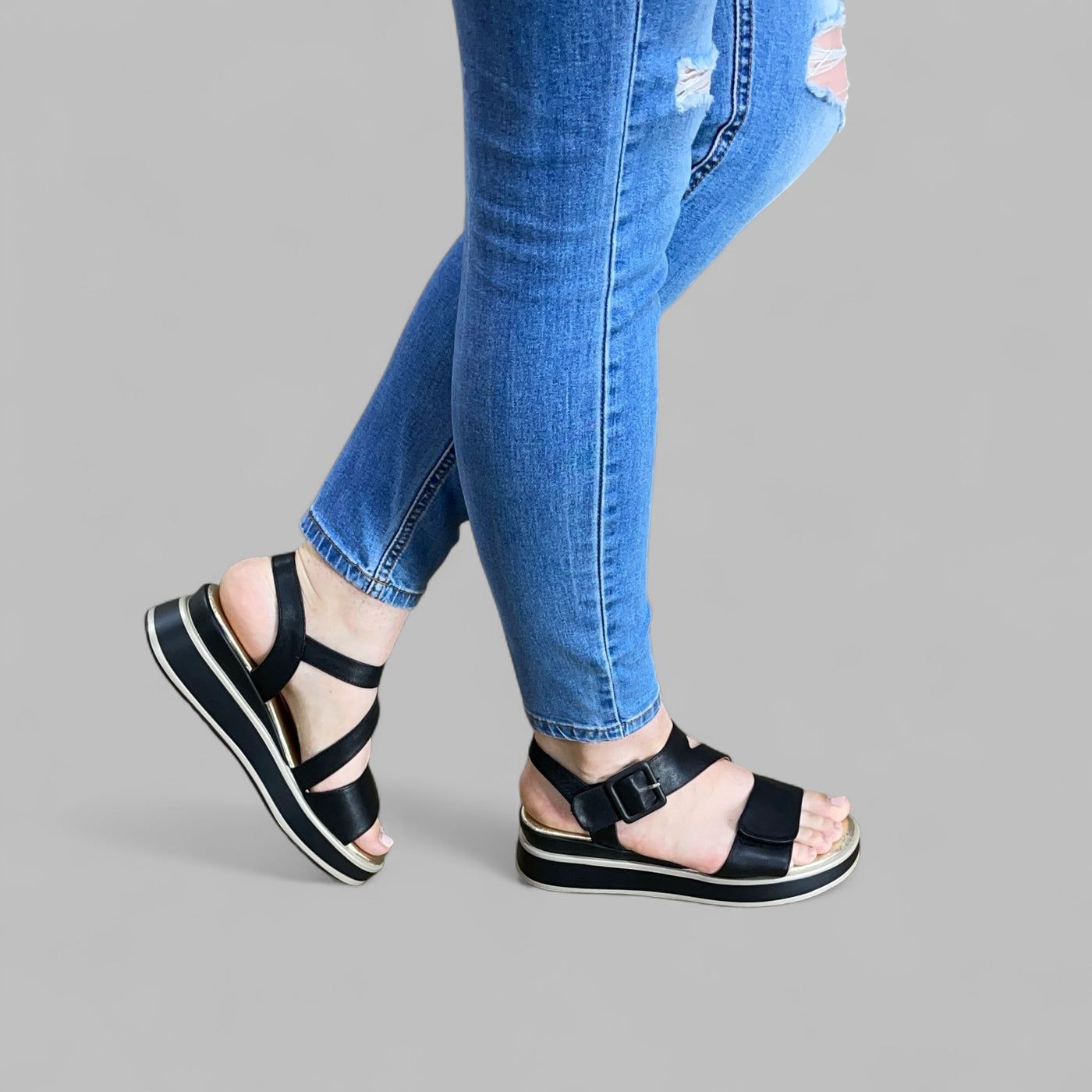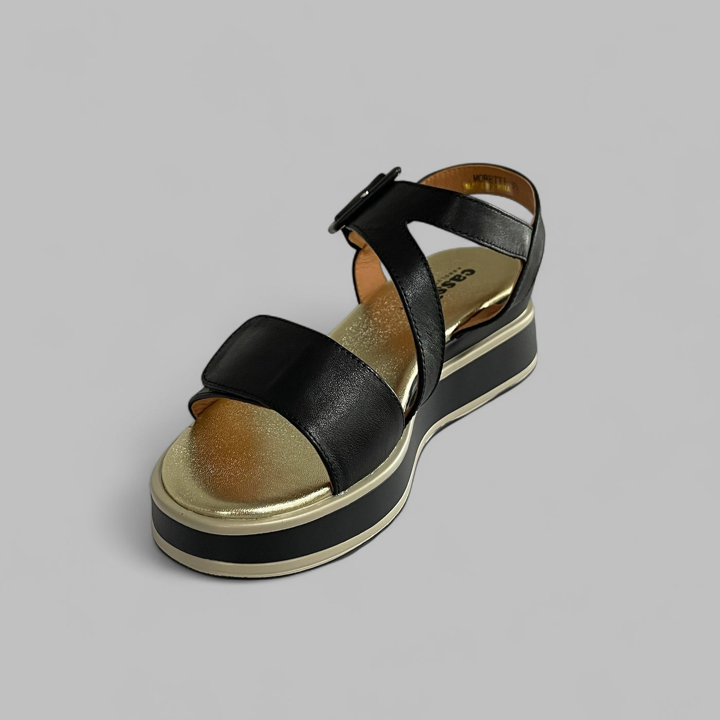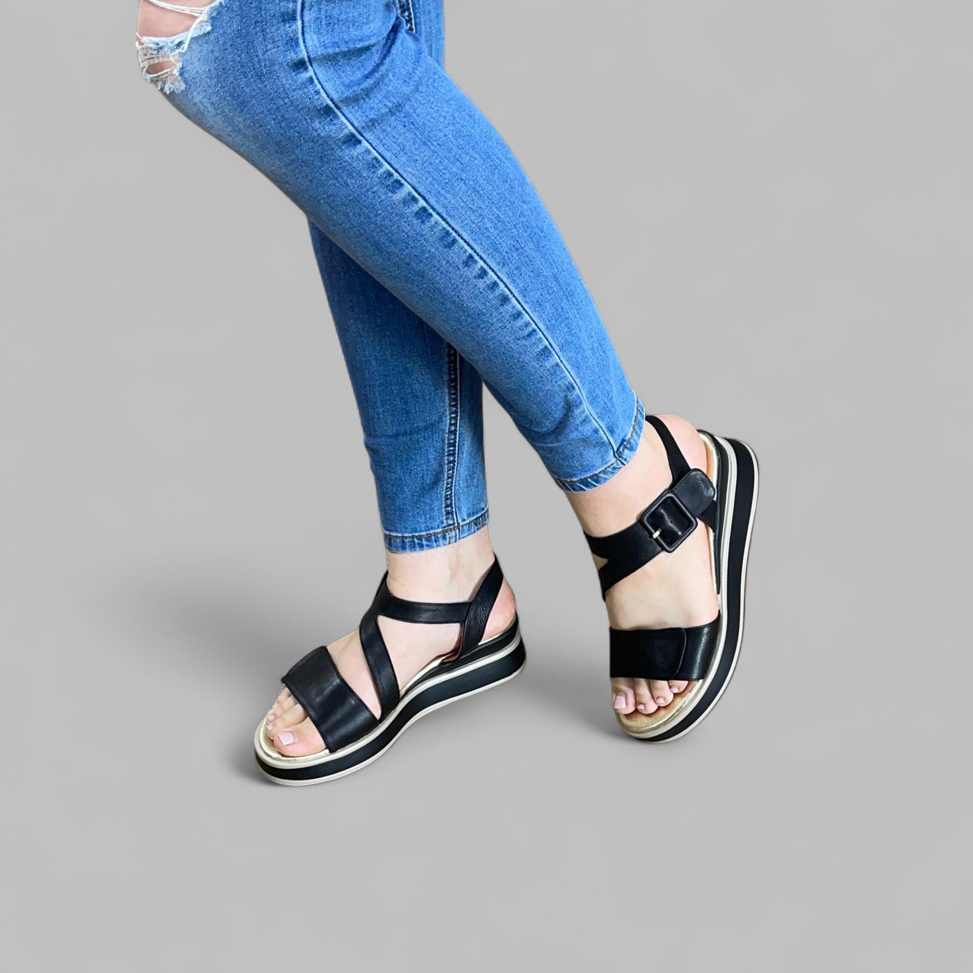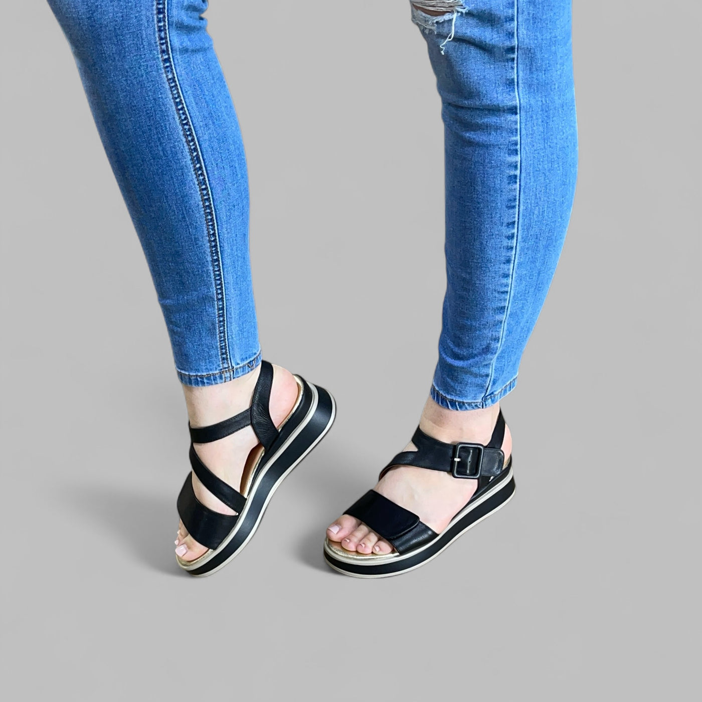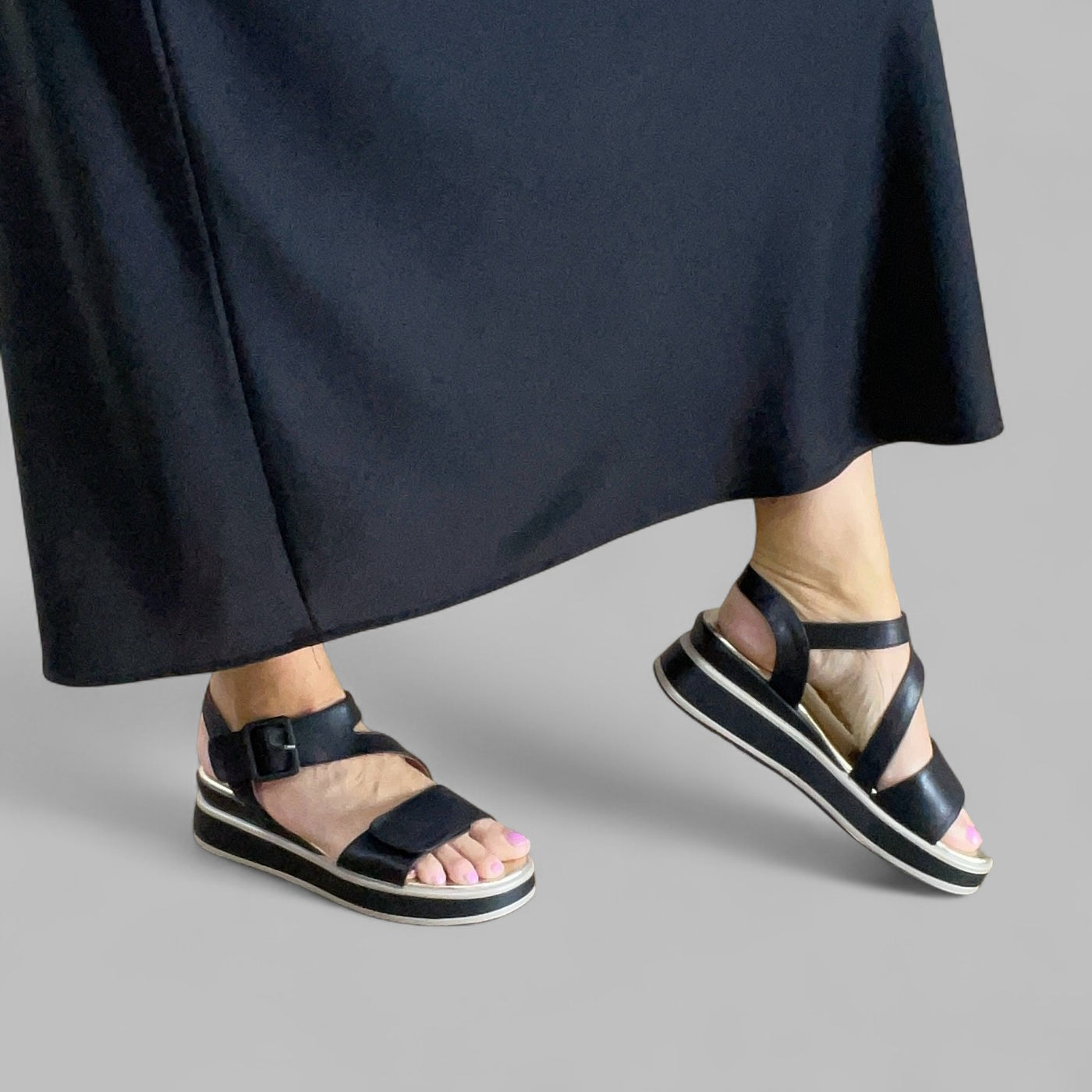 Step up in Moretti by Cassini — the platform sandal that defines laid-back sophistication. Crafted in sleek black with hook-and-loop straps across the toe and ankle, this style offers easy adjustability with a statement buckle accent. The cushioned insole and contrasting black-and-bone sole add comfort and contemporary flair to every outfit.