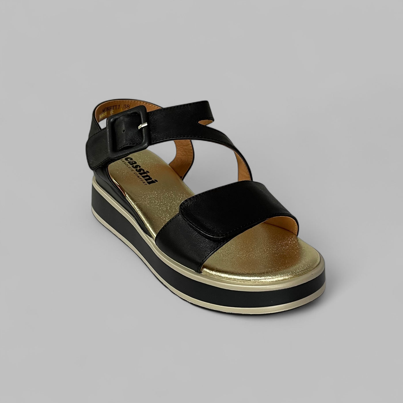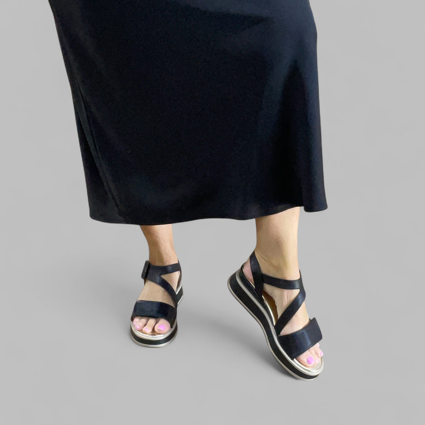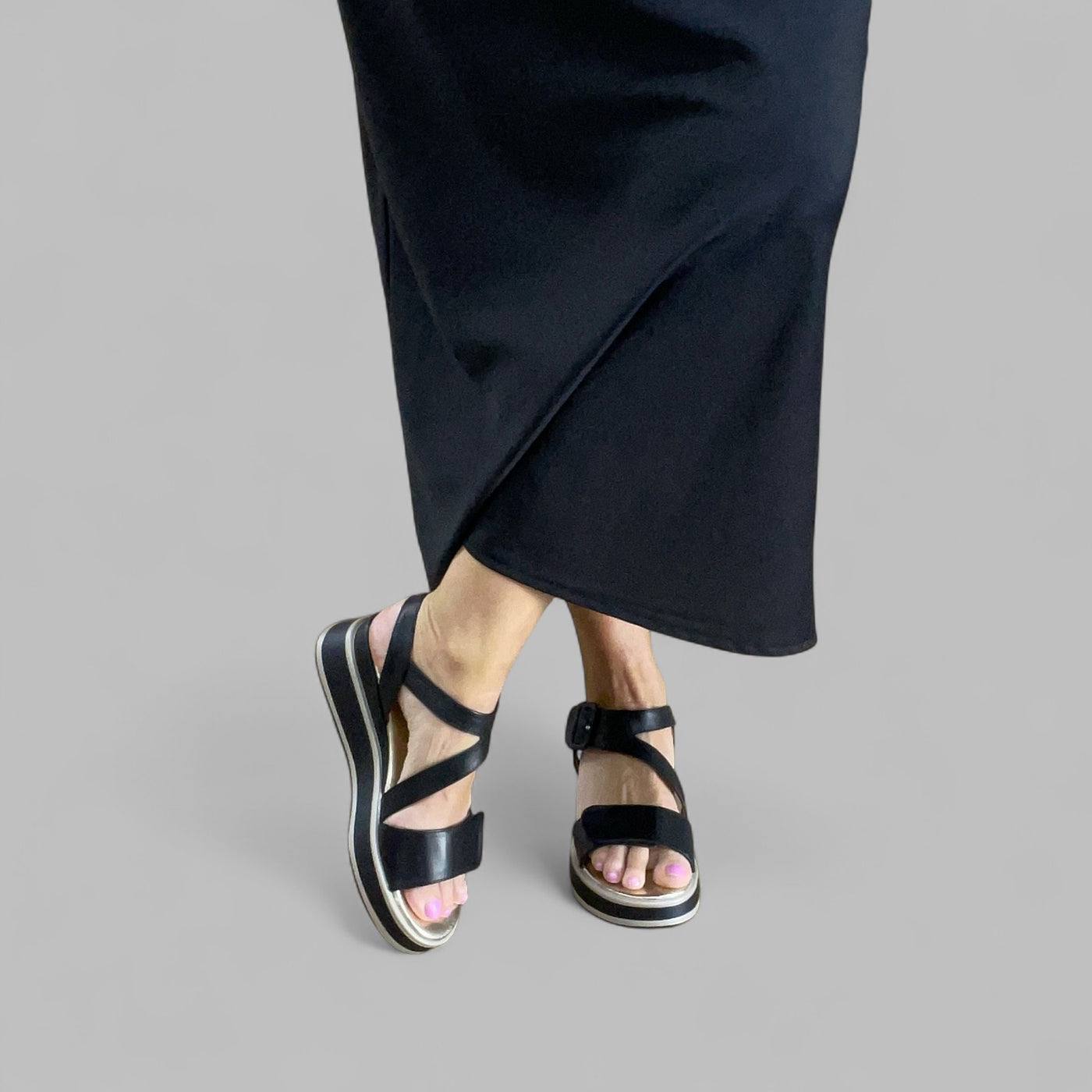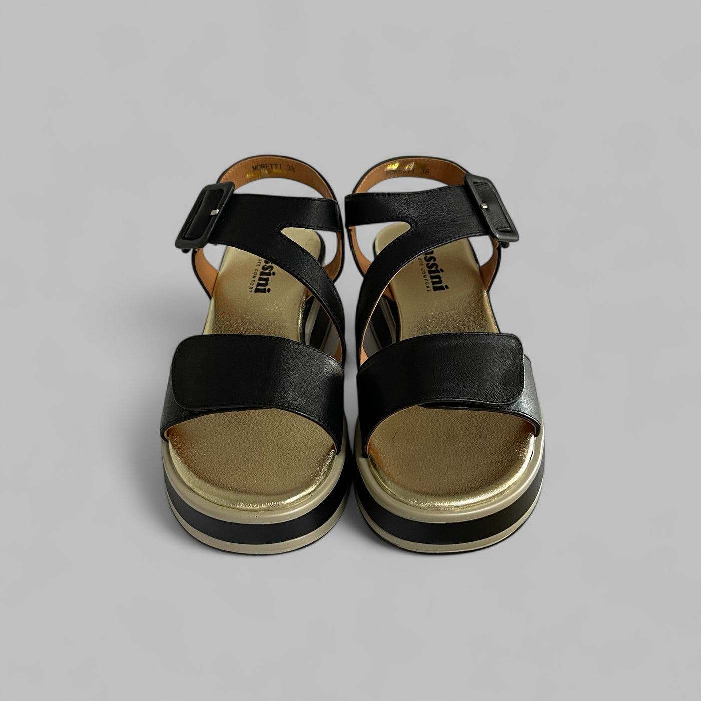 Step up in Moretti by Cassini — the platform sandal that defines laid-back sophistication. Crafted in sleek black with hook-and-loop straps across the toe and ankle, this style offers easy adjustability with a statement buckle accent. The cushioned insole and contrasting black-and-bone sole add comfort and contemporary flair to every outfit.