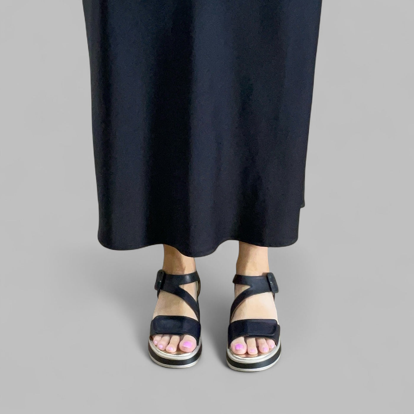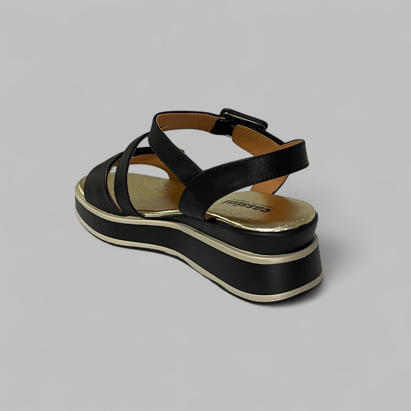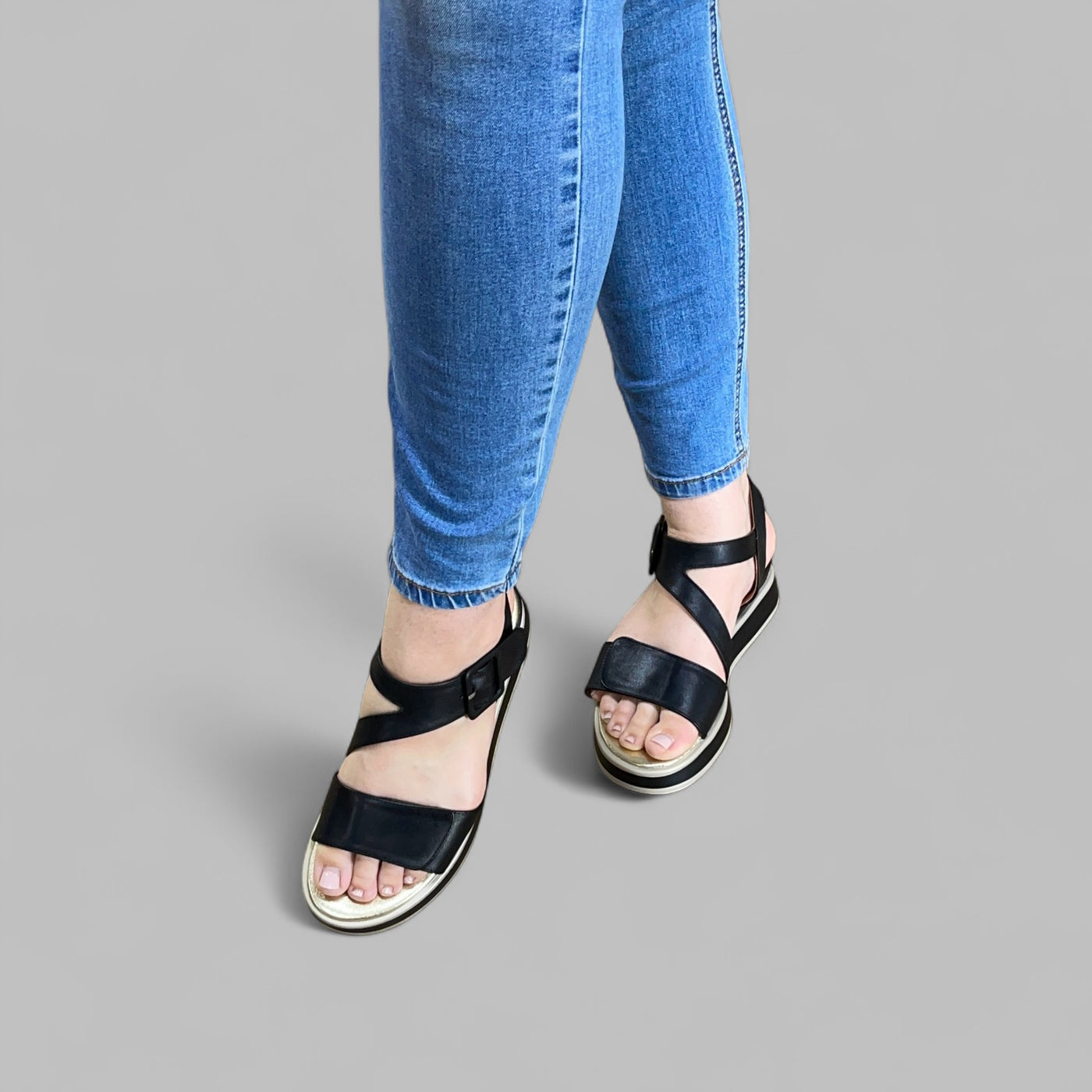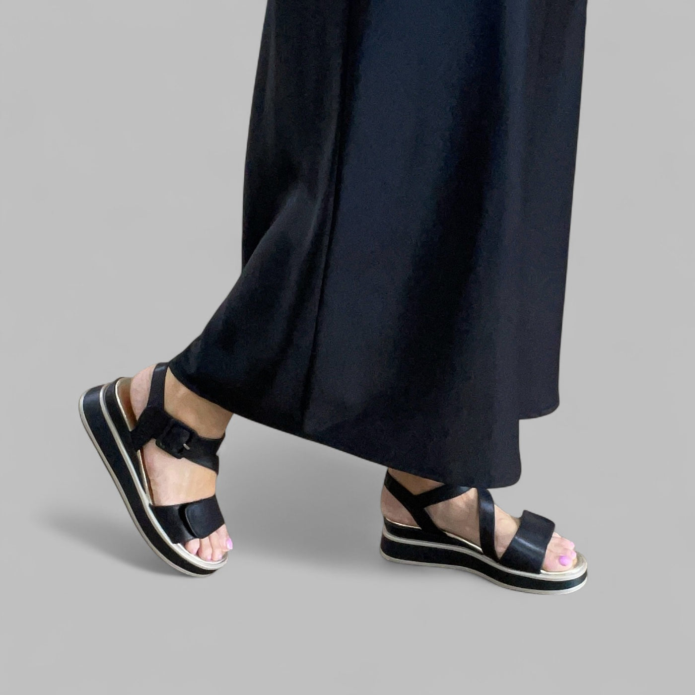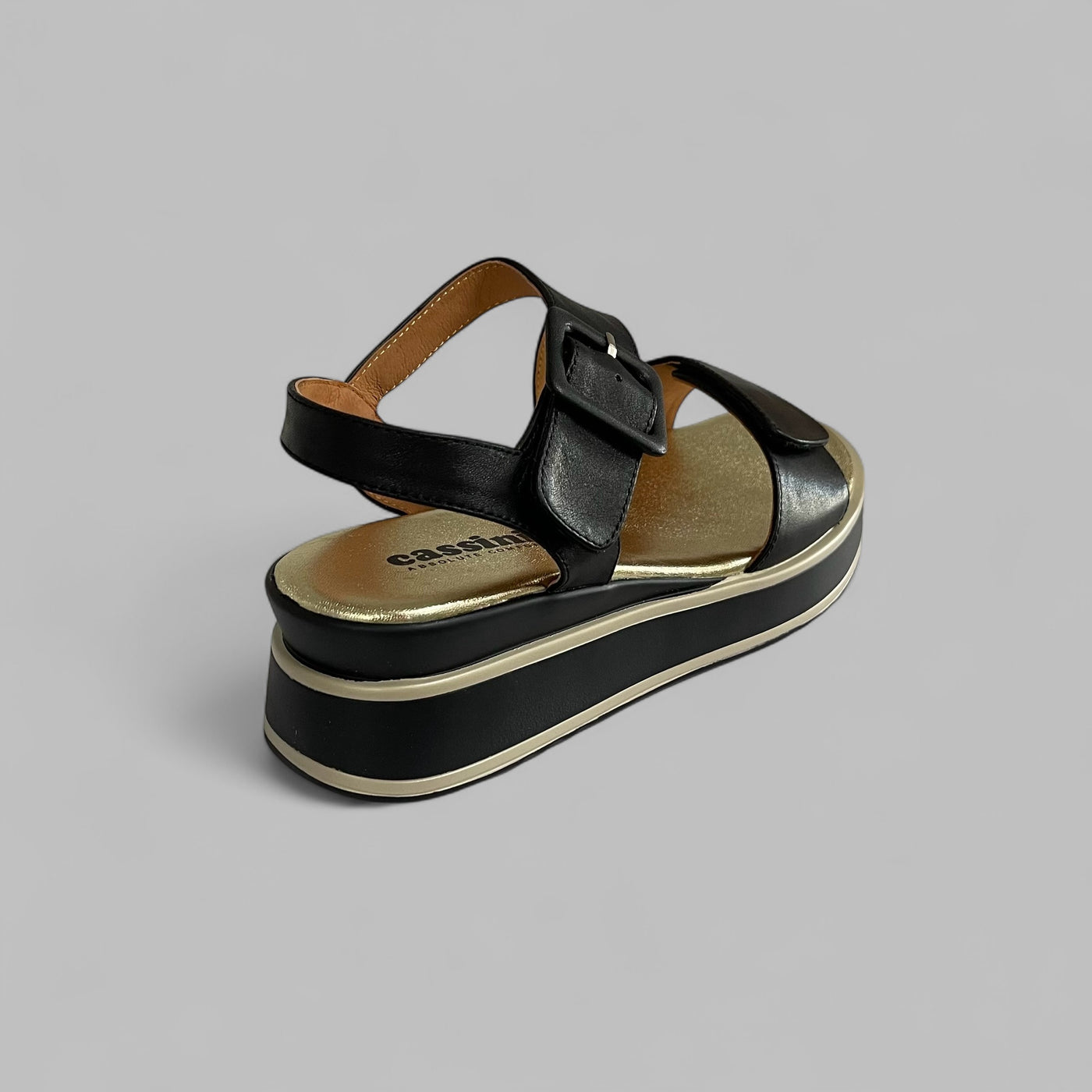 Step up in Moretti by Cassini — the platform sandal that defines laid-back sophistication. Crafted in sleek black with hook-and-loop straps across the toe and ankle, this style offers easy adjustability with a statement buckle accent. The cushioned insole and contrasting black-and-bone sole add comfort and contemporary flair to every outfit.