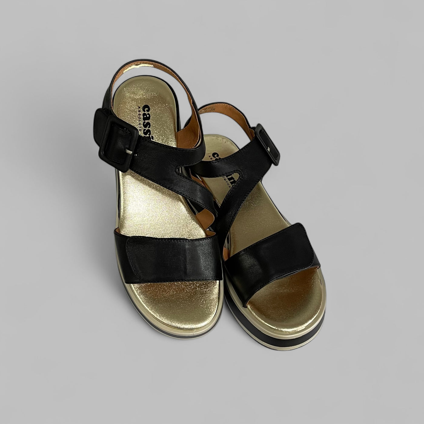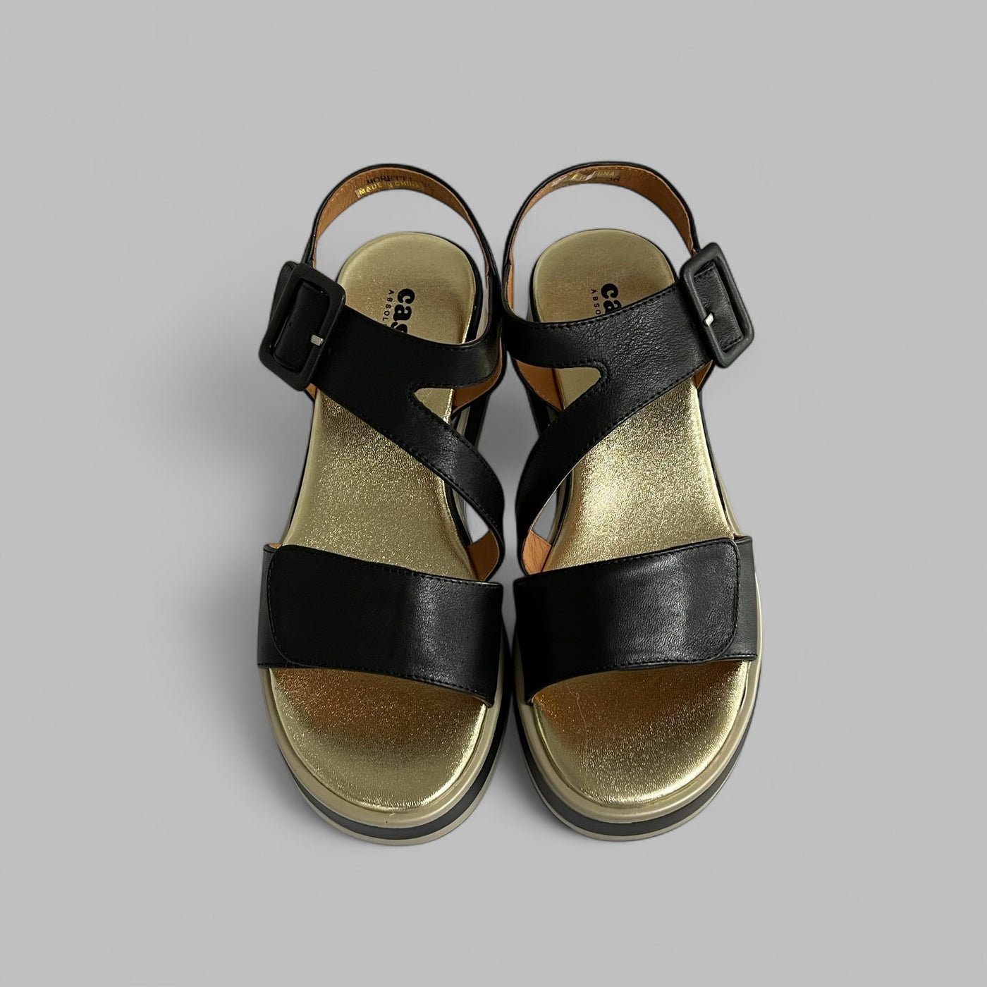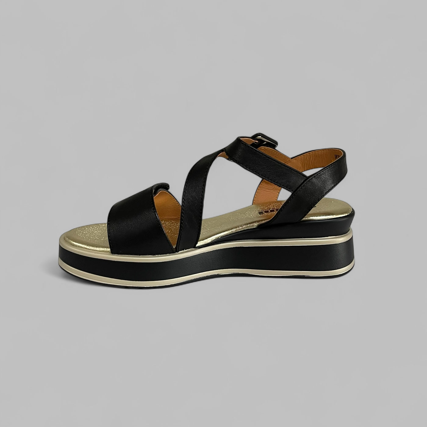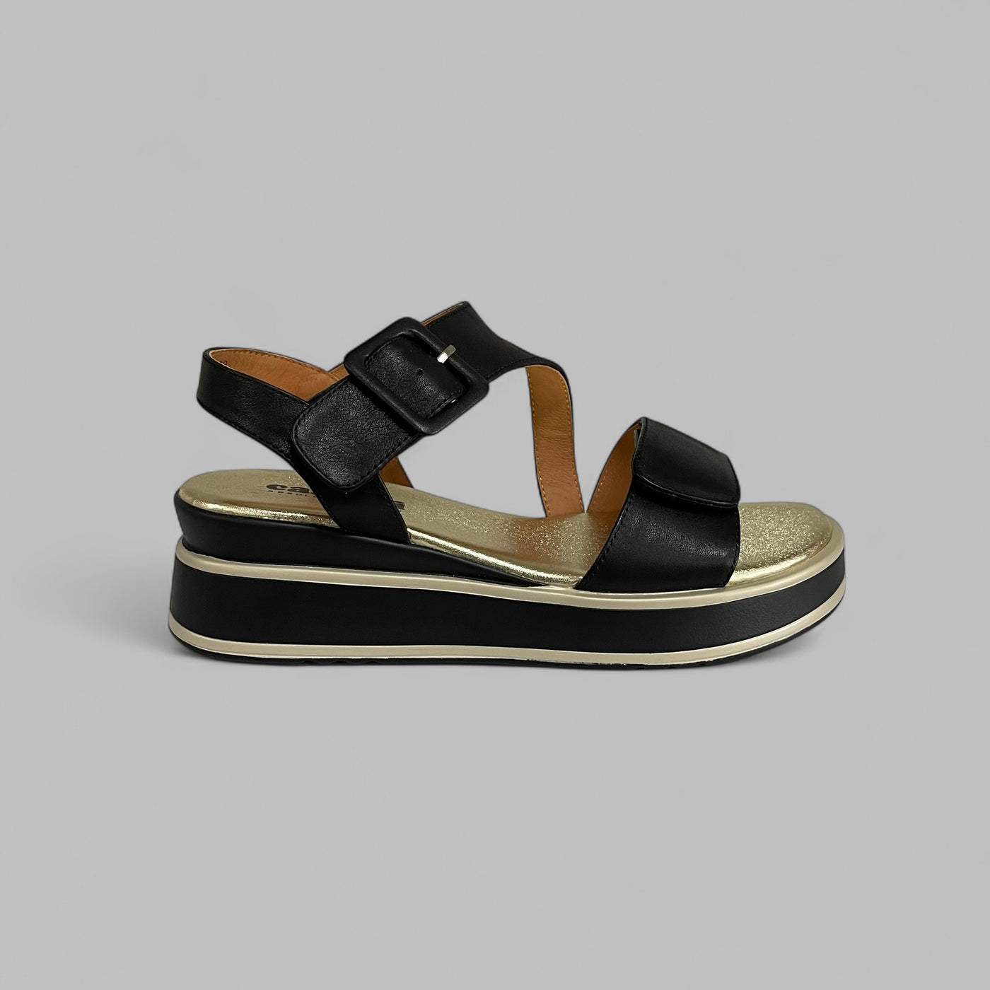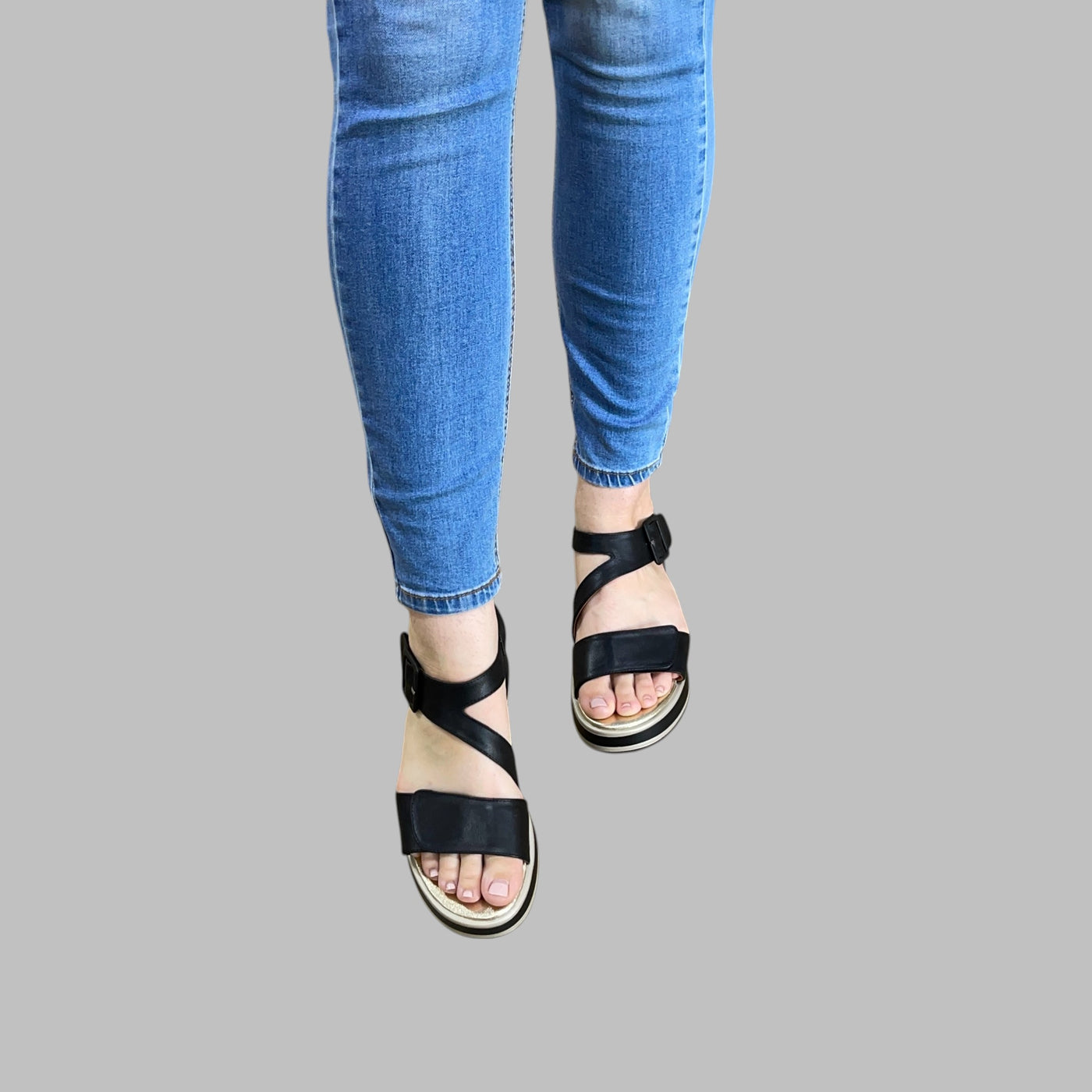 Step up in Moretti by Cassini — the platform sandal that defines laid-back sophistication. Crafted in sleek black with hook-and-loop straps across the toe and ankle, this style offers easy adjustability with a statement buckle accent. The cushioned insole and contrasting black-and-bone sole add comfort and contemporary flair to every outfit.