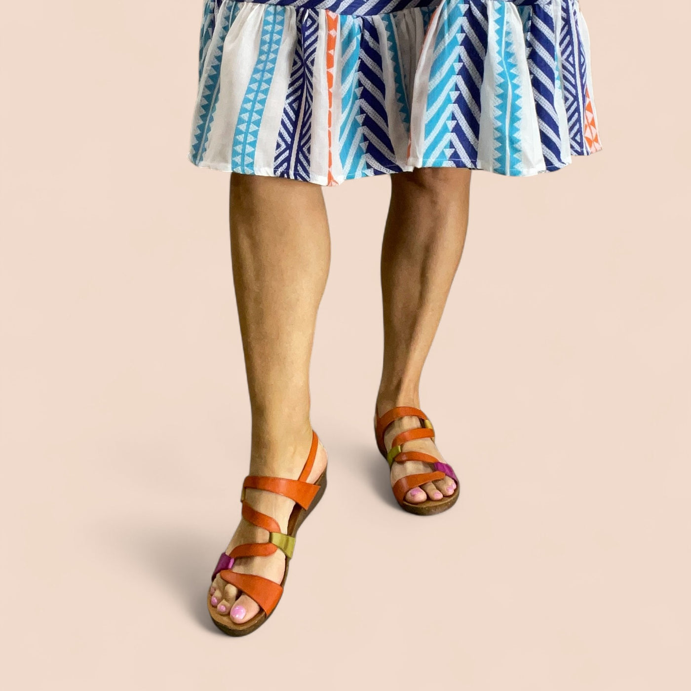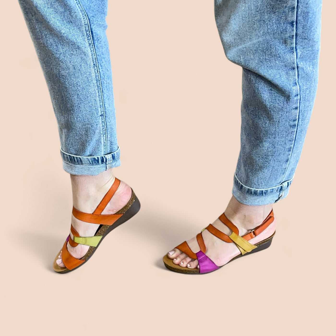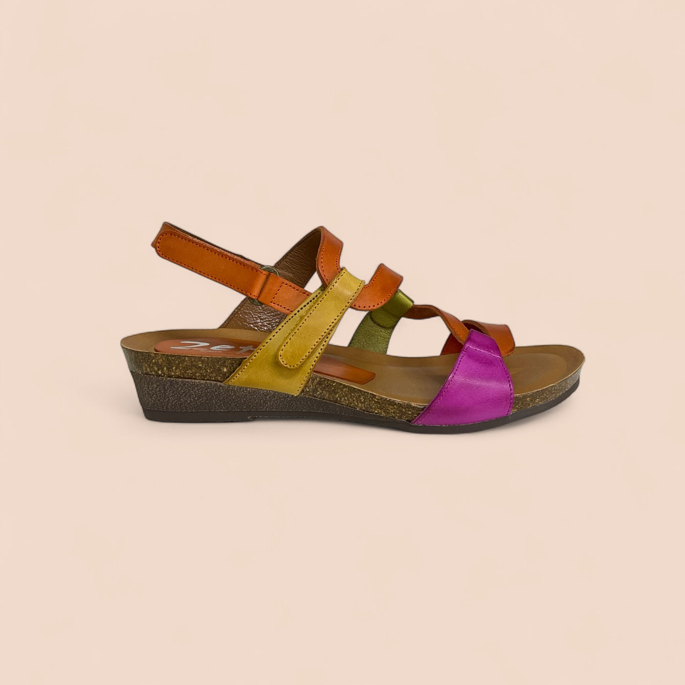 The Osina sandal by Zeta isn’t here to whisper, it’s here to shine. Bursting with orange, fuchsia, green, and mustard, the striking S-shaped strap design winds up the foot like wearable art. Made in Spain with a cushioned insole and a chic small wedge, Osina delivers statement style without sacrificing comfort. The easy hook-and-loop closure keeps things practical, but the colour play makes every step unforgettable.