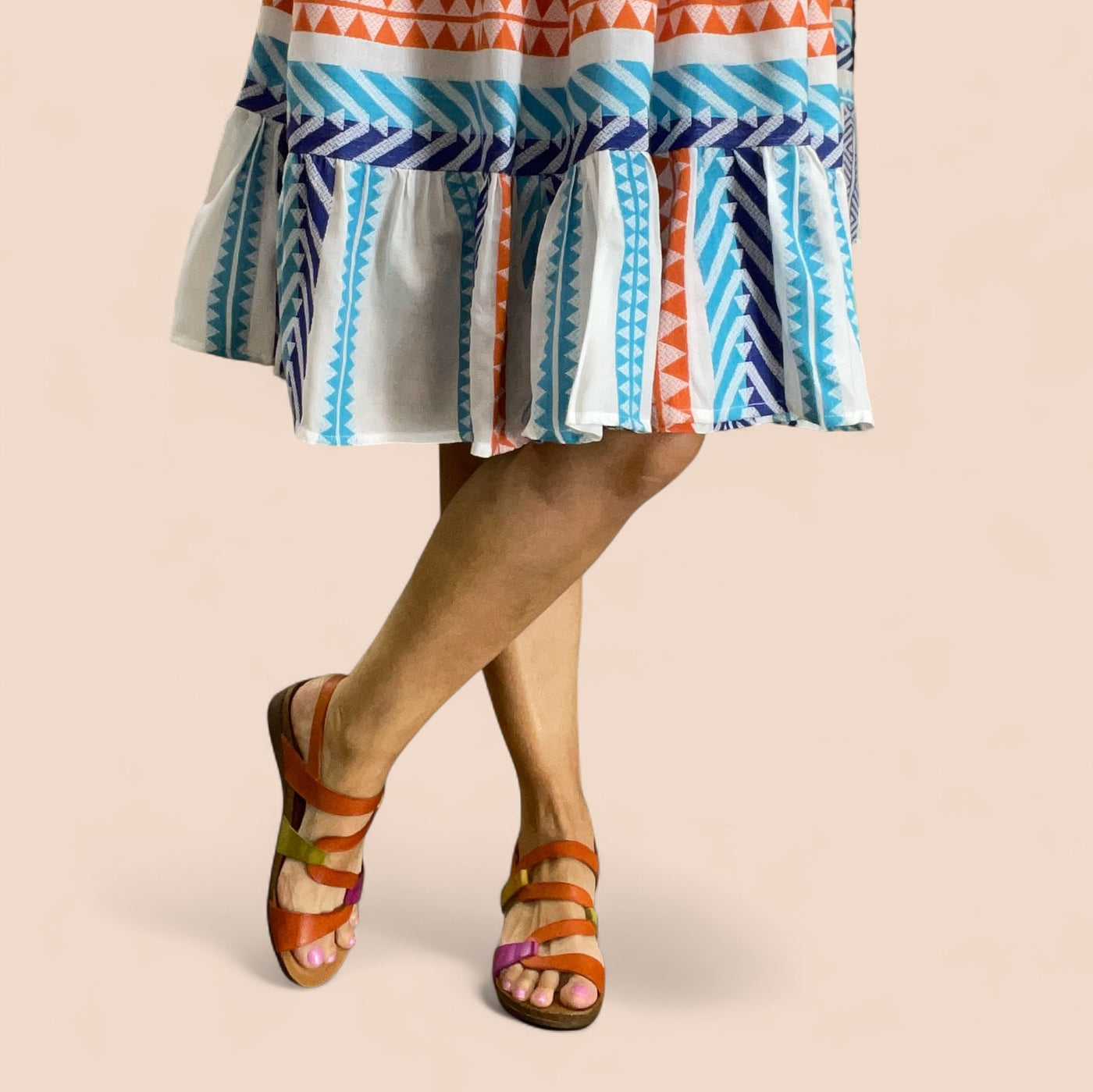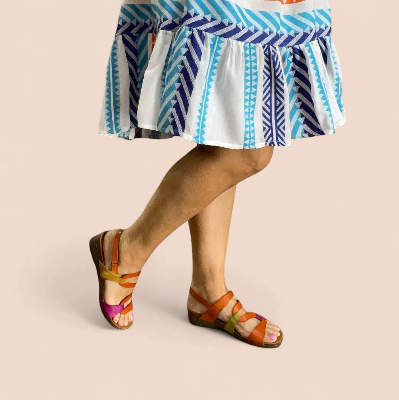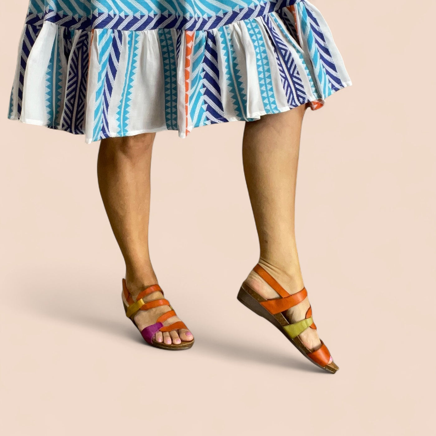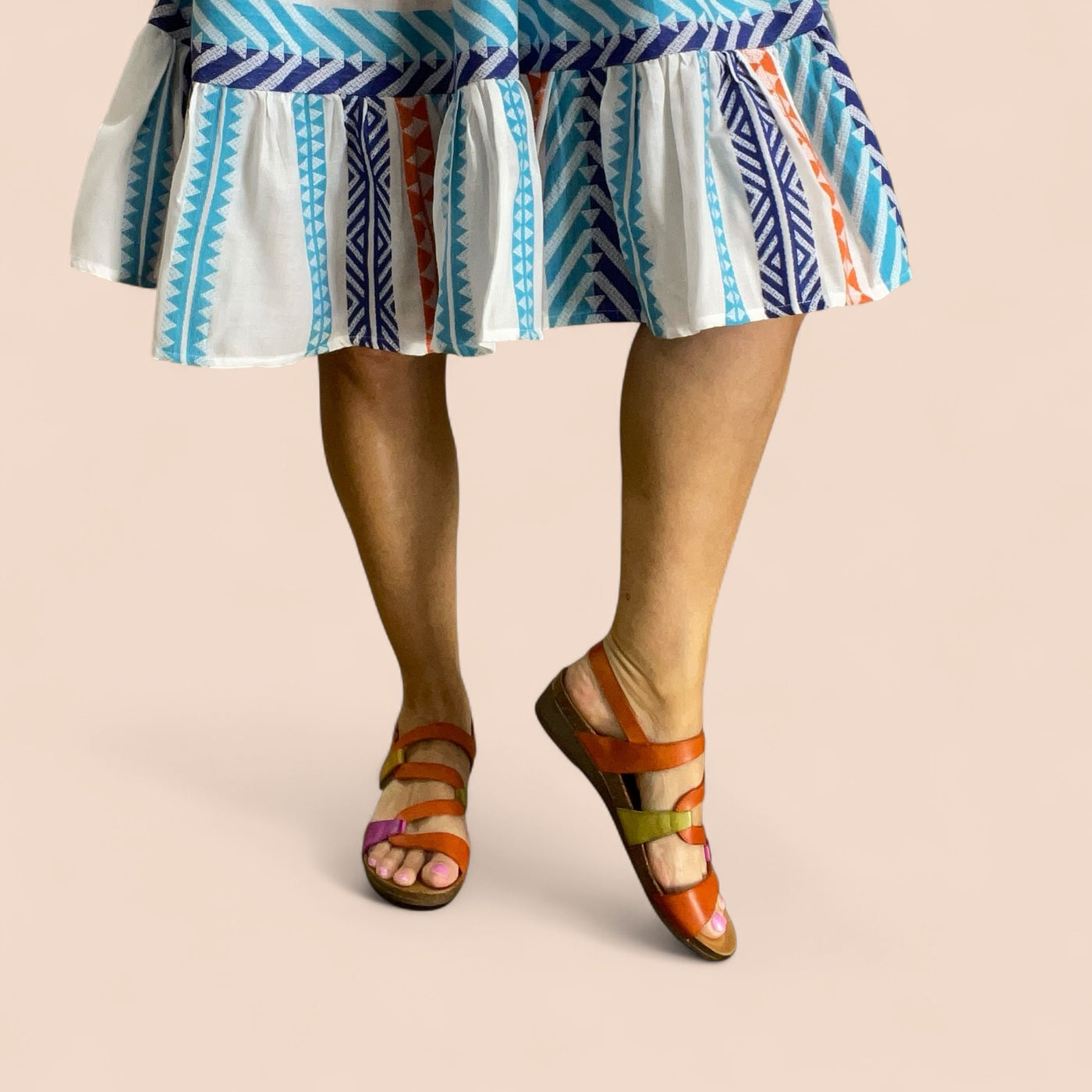 The Osina sandal by Zeta isn’t here to whisper, it’s here to shine. Bursting with orange, fuchsia, green, and mustard, the striking S-shaped strap design winds up the foot like wearable art. Made in Spain with a cushioned insole and a chic small wedge, Osina delivers statement style without sacrificing comfort. The easy hook-and-loop closure keeps things practical, but the colour play makes every step unforgettable.